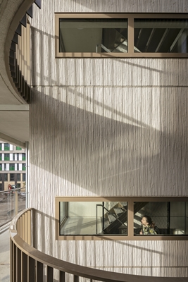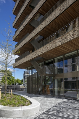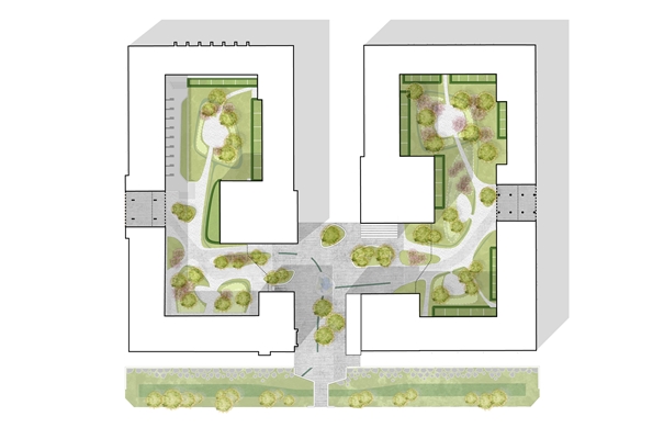Door de voorgeschreven openingen in de twee bouwblokken tegenover elkaar te leggen is een duidelijke entree naar de binnengebieden gemaakt. Gecombineerd met twee poorten in de lange zijdes van de blokken geeft dat een campusachtige sfeer. Het is hierdoor een gebouw dat alleen voorkanten heeft