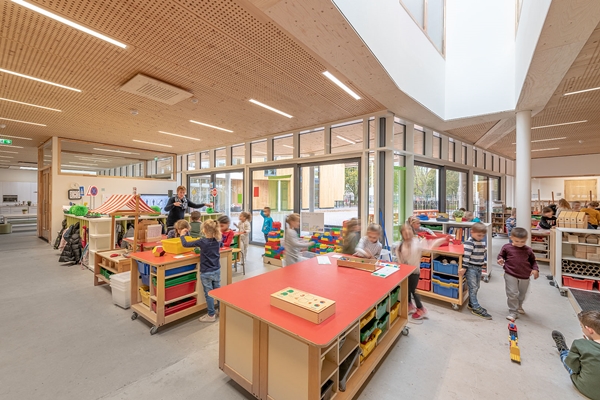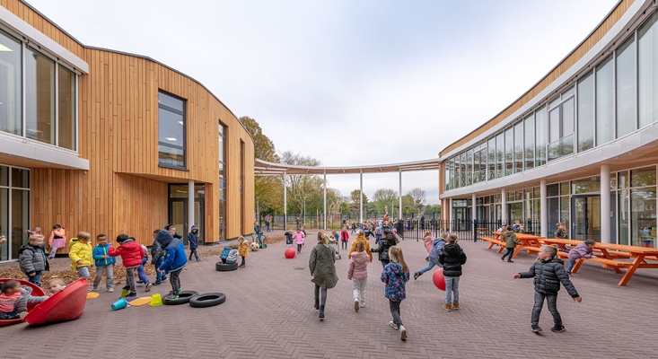 De peuterspeelzaal is aansluitend op de onderbouw gesitueerd, zodat een doorgaande leerlijn en samenwerking tussen de gebruikers is gerealiseerd. Het vloerveld op de begane grond voor 0 tot ca 6 jaar sluit, onder een groot overstek, direct aan op het hof. Omdat de glazen gevel voor een groot deel kan worden geopend, ontstaat een openluchtschool, waar ‘binnen en buiten’ gezamenlijk de onderwijsruimte vormen.