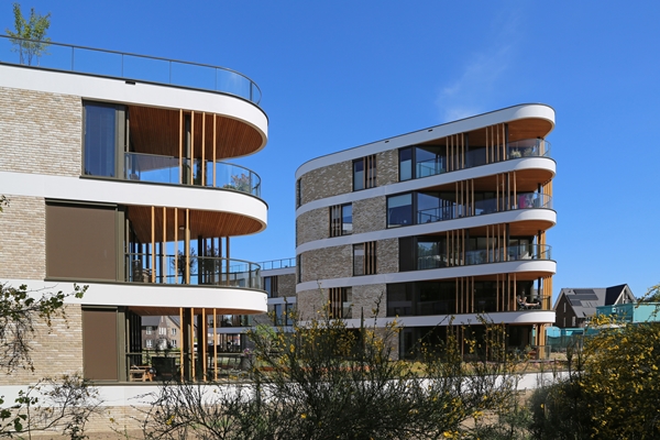 De afgeronde vormen en vloeiende lijnen verzachten de contouren, waardoor het park ontspannen langs en tussen de gebouwen door vloeit. Elk appartement ligt aan een afgeronde hoek, zodat je vanuit iedere woonkamer vrij uitkijkt op het omliggende groen dat zo kenmerkend is voor deze locatie. De aansluitende, meerzijdige terrassen vormen als bijzondere buitenkamer vervolgens de ultieme schakel tussen woning en natuur. Het heldere lijnenspel met de vloeiende, organische vormen wordt doorgezet in de plint van het gebouw. Vanuit het park loopt het maaiveld tussen de gebouwen schuin omhoog. Dit nodigt uit om het terrein te betreden.
