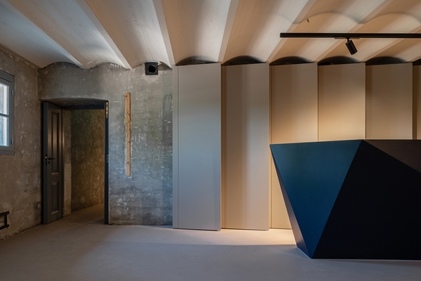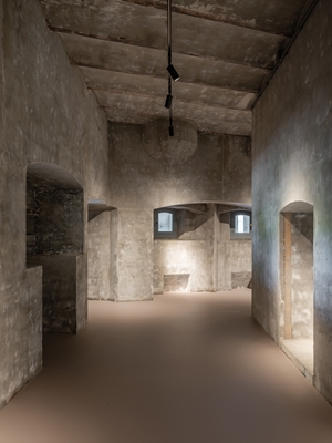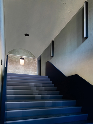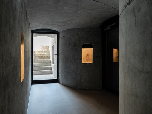 Zo worden warme, houten wanden en minimalistische, stalen elementen gecombineerd met ruwe, onafgewerkte wanden van ongewapend beton, moderne lichtarmaturen met sfeervol verlichte kaarsnissen. Het materiaal- en kleurconcept verbindt de historische en hedendaagse elementen en laat ze tegelijkertijd waardig naast elkaar bestaan.