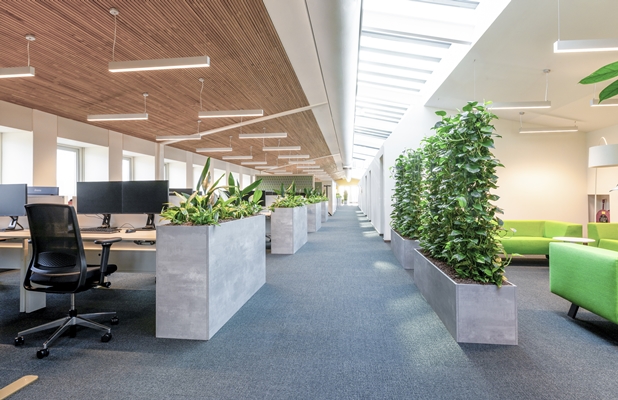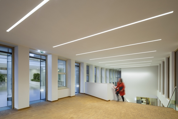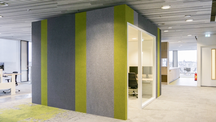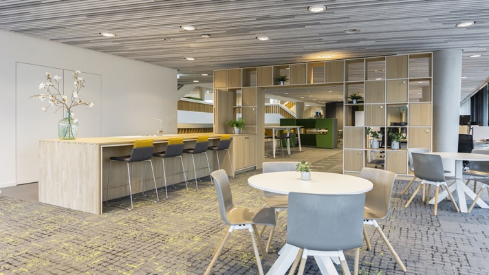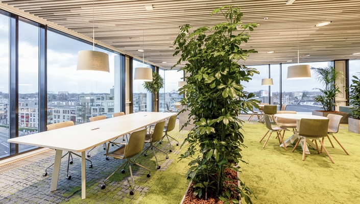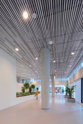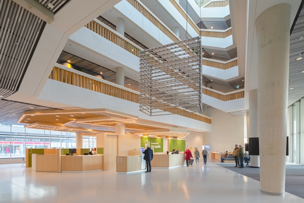 Op de begane grond, gericht naar het plein, bevindt zich de hoofdentree. Daar komen bezoekers binnen op het ruimtelijke publieksplein. Via de eerste verdieping is er direct toegang tot de tien meter brede passerelle die nieuw en oud verbindt. Ambtenaren hebben toegang tot de zeven verdiepingen rondom de ruime vide. Daar liggen splitlevel kantoorvelden met flexibele (stilte)werkplekken die van twee kanten worden overgoten met daglicht. Van onder naar boven verkleuren de kantoorverdiepingen van grijs naar groen, symbolisch voor de reis van de stad – met veel contrasten, kleuren uit de staaltechniek en reuring – naar het natuurlijke buitenleven – met groen, bomen en stilte –. Hoe hoger in het gebouw, des te meer stilte en rust men ervaart. Grote raampartijen komen overal terug en leggen een continue verbinding met de stad.