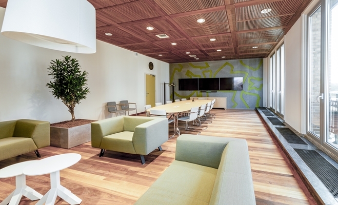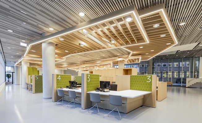Circulaire en duurzame oplossingen zitten ook tot in de kleine details van het interieur van beide gebouwen. Het vaste meubilair – ontvangstbalies, pantry’s en displaykasten – is ontworpen met een speciale Hengelose houtverbindingen waarmee ze de- en remontabel zijn. Hierdoor zijn ze én direct herbruikbaar op een nieuwe plek én kunnen afzonderlijke grondstoffen een tweede kans krijgen. Er is 400 m² aan gemelamineerd plaatmateriaal uit de oorspronkelijke huisvesting hergebruikt in nieuwe kasten en flexibele tussenwanden. Beide zijn bekleed met PET-vilt: akoestisch platen gemaakt van gerecyclede PET-flessen. In het PET-vilt zijn de contouren van Hengelose wijken gestanst terwijl dezelfde contouren ook in het behang zijn verwerkt. Nieuwe materialen zijn cradle-to-cradle en hebben een lage milieubelasting. Zoals het FSC-gecertificeerd inlands eiken en snelgroeiend Nederlands populierenhout. Ook het restaurant is maximaal duurzaam: lokale horeca verzorgen de catering en al het GFT-afval wordt verzameld, vermalen en verwerkt tot droge compost dat naar de kinderboerderij gaat voor gebruik in de moestuin.