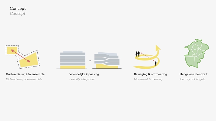 Het bestaande stadhuis is onderdeel van het collectief geheugen van de Hengeloër en maakt nadrukkelijk deel uit van het stadsleven door de vele evenementen die in de stadshal plaatsvinden. Bij de totstandkoming van het ontwerp vormden de locatie en rol van het stadhuis, samen met de kenmerken van de stad, een belangrijke inspiratiebron voor het ontwerp. Het renovatie- en nieuwbouwontwerp tonen respect voor het iconische jaren’60 Rijksmonument van architect J.F. Berghoef. In beide gebouwen keren Hengelose technieken en tradities terug. Deze aanpak maakt beide gebouwen samen tot één ensemble met typisch Hengelose uitstraling, een karakteristieke knipoog naar het verleden en hightech blik op de toekomst.