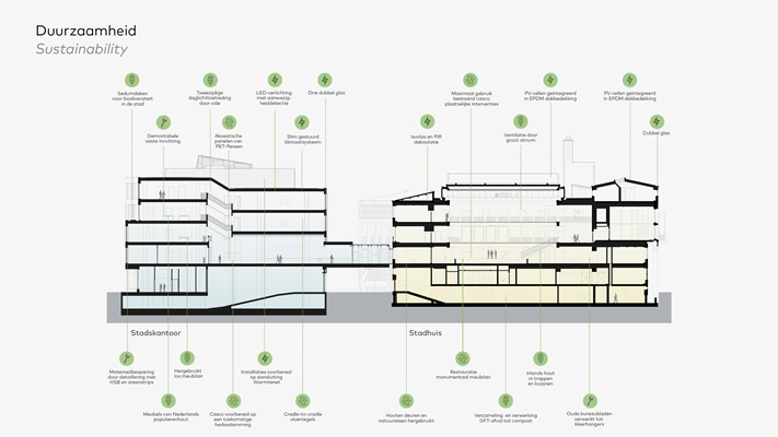 Vanaf aanvang van het project speelde duurzaamheid bij alle ontwerp- en materiaalkeuzes een belangrijke rol. Hergebruik van het bestaande stadhuis levert een majeure bijdrage aan de hoge ambitie op dit vlak. Samen met hergebruik van materialen, nieuwe materialen met lage milieubelasting en de toevoeging van zonnepanelen, duurzame installaties en een slimme koppeling met het nieuwe stadskantoor is een sterk verlaagd energieverbruik bereikt. In het stadskantoor zorgt plafondverwarming en -koeling voor een aangenaam binnenklimaat. Daarbij zorgt hier de betonkernactivering (thermische activering) ervoor dat de vloer in staat is om warmte en koude te bufferen wat zorgt voor een energie-efficiënt binnenklimaat. Alle maatregelen samen besparen de gemeente ruim een half miljoen Euro op de jaarlijkse energierekening.