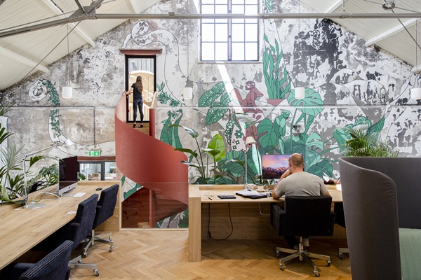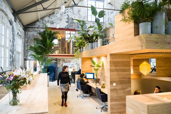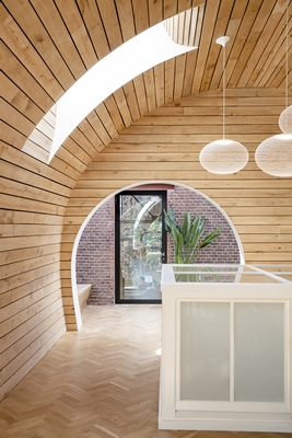 De nieuwe toevoegingen zijn herkenbaar door zacht eiken en rood staal en vormen een aangenaam contrast met de industriële schil. Grote ingrepen staan als een monoliet vrij in de ruimte. Zoals de houten bar in het café en het ‘Arendsnest’, een verzonken houten volume in de Ketelhal die ruimte biedt aan verschillende activiteiten. Voor een informele vergadering duik je een van de verdiepte zitjes in. De randen bieden werkplekken om even kort aan te waaien. En als je ongestoord wil werken klim je bovenop het blok, waar je wordt omgeven door een zee aan planten. Waar oud en nieuw samenkomen, werkt glas als transparante schakel tussen de twee materialen. Zoals bij de nieuwe houten optopping boven de Accuhal, die door een horizontale glazen strook zweeft boven het bakstenen volume. Deze uitbreiding sluit in schaal goed aan op de nieuwe stedenbouwkundige situatie, met de verbreding van de naastgelegen Sebastiaansbrug. Op verschillende manieren is de transparantie van het gebouw vergroot. Nieuwe openingen in bestaande muren maken lange zichtlijnen, van de Schie tot de bar en van de bar tot de schoorsteen. Zo ontstaat een interne samenhang die tot nu toe in het complex ontbrak en gaat het pand een relatie aan met de omgeving. Openingen op grotere hoogte zorgen voor verrassende momenten in het pand. Zoals het geval is bij vergaderruimtes ‘de Uitkijk’ en ‘Door de muur’. Deze glazen uitkragingen prikken dwars door massieve muren heen en bieden een nieuw perspectief op de werkruimte.