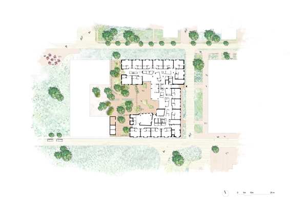 Op de begane grond is er een muziekruimte en zijn er ruimtes voor zorgfuncties zoals fysiotherapie en ergotherapie.