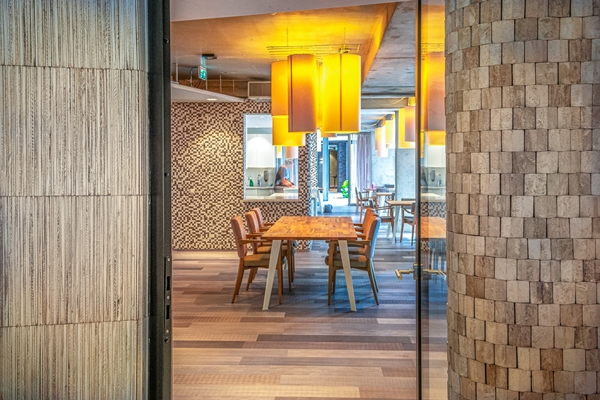 Elke verdieping heeft eigen voorzieningen zoals een centrale keuken, een eetruimte, een kleine bibliotheek en zitgedeelten (woonkamers). Ook hier zijn verschillende materialen en kleuren toegepast.
