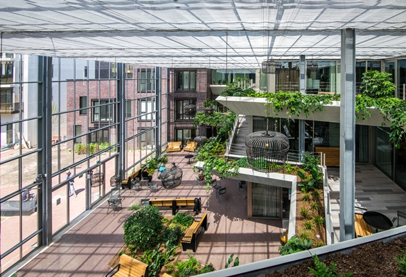 In Zuidoever ademt alles een natuurlijke sfeer. Al bij de entree verraden grote vlakken verticaal groen de tuinatmosfeer van het gebouw, het ruikt er zelfs naar planten. Binnen opent zich een lichte wereld met een kas (wintertuin) die de bouwblokken met elkaar verbindt. Een aangenaam tussenklimaat waar mensen elkaar het hele jaar door kunnen ontmoeten, ook als het slecht weer is. De uitstraling van de binnentuin is die van een tuin met houten tuinbanken en -tafels, comfortabele stoelen van riet met gekleurde kussens passend bij de parasols. Door de consequente uitwerking weten de bewoners waar ze zijn, alles geeft het signaal ‘tuinterras’ af. Het groen is als een waterval doorgetrokken tot aan de hoogste verdieping zodat ‘buiten’ letterlijk naar binnen wordt gehaald. Alle bewoners wonen aan groen. Dat nodigt uit om naar de tuin te gaan, frisse lucht op te snuiven en zonlicht te krijgen.