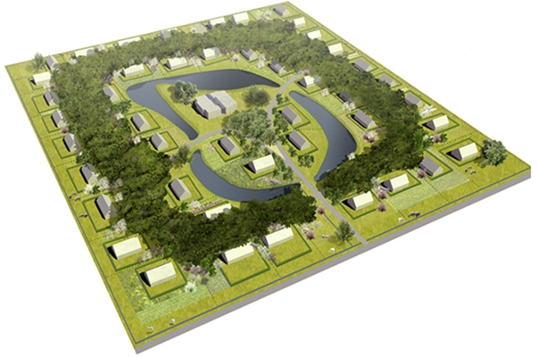 Het plan bestaat uit een centraal eiland, een vijverring, een bomenring en een weilandring. De grond wordt volledig uitgegeven in kavels van 1200m2 tot 2500m2. Hier bouwen de kavelhouders hun eigen huis met veel vrijheid qua architectuur. Het plan is duurzaam en zelfvoorzienend in structuur en uitwerking. Het voorziet in waterberging, individuele zuivering van het afvalwater en ook in nutsvegetatie. Zo is de vijverring tevens waterberging, bestaat de bomenrand uit tamme kastanjes, walnoten, fruitbomen, noten- en bessenstruiken. Rondom het kavelgebied ligt een vrij toegankelijke weilandstrook waar schapen sinds deze lente het gras kort grazen.