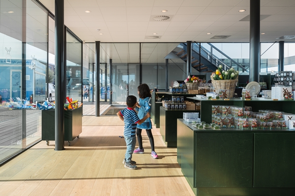 Het gebouw bestaat uit drie zones: de entree, de winkel en het café. In elk van deze ruimten is een passende sfeer opgeroepen. De entree heeft een koel karakter en krijgt de frisheid van ochtendgloren, gelijk aan de start van het bezoek aan Kinderdijk. De robuuste en kleurrijke balie is een eyecatcher die bezoekers naar binnen trekt. Stroken materialen van onder meer linoleum, tegels, perspex en vilt wisselen elkaar af.