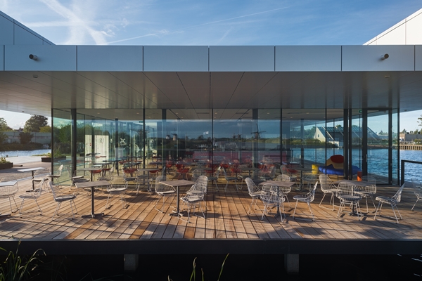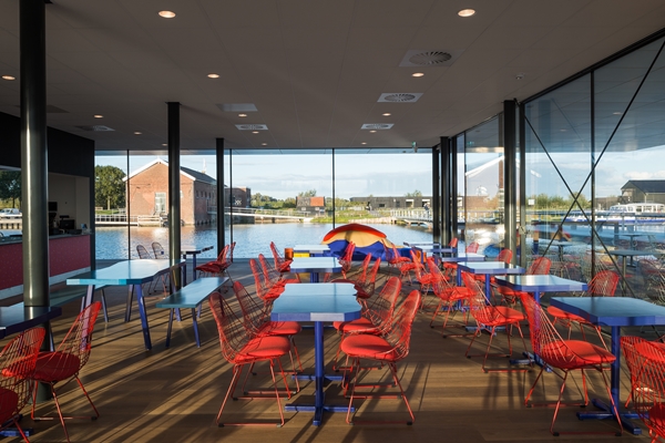 Het café is voor langer verblijf en krijgt een warme uitstraling, zoals de intens rode reflectie van de zon in het water. De tafels zijn organisch vormgegeven als de golvend water. De bekende Wire Chair-stoelen van Pastoe zijn uitgekozen op elegantie en lichtheid en hun Nederlandse komaf. Als toevoeging op de gangbare zitmogelijkheden ontwierp Lilith Ronner van Hooijdonk een loungebank. Het meubilair op het terras komt overeen met de inrichting van het café, zodat in de zomer wanneer de gevel open is het geheel één ruimte vormt.