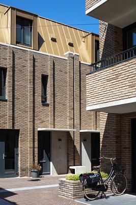 De acht stadswoningen zijn voorzien van een tuin en optioneel een dakterras en liggen tussen intieme straten en pleinen. Een smalle privé zone voor woningen met bankjes en een luifels geeft de bewoners hun eigen plek. Ook de studiowoningen hebben een privé buitenruimte aan de straat, waardoor een levendig straatbeeld ontstaat. De Koningin vormt samen met haar hofdames een goed afgestemde mix tussen warme kleinschaligheid en grootstedelijk wonen.