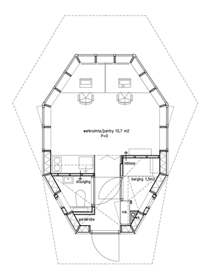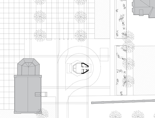 In het ontwerp is omgegaan met deze monumentale context, op een manier die verder bouwt met de kenmerkende thema’s. Het nieuwe gebouwtje is achthoekig, gelijk aan de vorm van de historische, afgebroken portiersloge. Deze vorm is ideaal voor de functie; het garandeert de juiste zichtlijnen voor de portiers van binnen naar buiten en andersom, voor de bezoekers naar het gebouwtje en landschap. Het vormt bovendien een mooie echo van de kop van de bakkerswinkel.