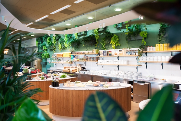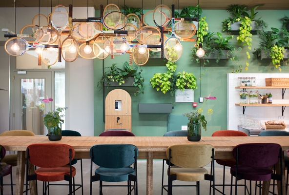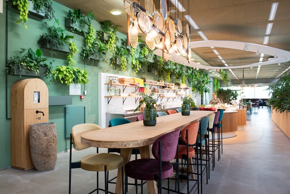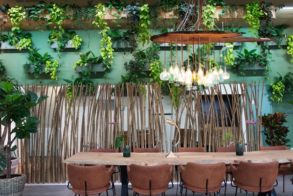 De Verpan-stoelen – oorspronkelijk door Verner Panton in 1967 ontworpen voor een restaurant in Kopenhagen – zijn met groene en bruine bekleding gestoffeerd en staan rond door Leysner ontworpen tafels. De tafelbladen en het barblad bestaan uit een groene marmervariëteit. Er is een veelheid aan grote planten en een groenmuur. “Planten geven energie en zuiveren de lucht”, zegt Leysner.