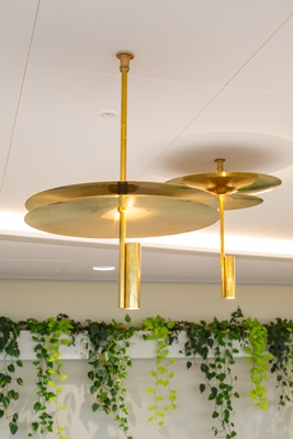Zo verwijst elke lamp nog eens naar een pijler in het concept van De Nieuwe Draai: vermijden van verspilling (de flessenlamp), gezondheid en welzijn (de tennisrackets) en de dynamische community (spiegels, vanwege de ‘zelfreflectie’ en ‘elkaar spiegelen’, aldus Leysner. De vierde pijler, Total energy, krijgt een kroonluchter in het atrium, wanneer die voltooid is.