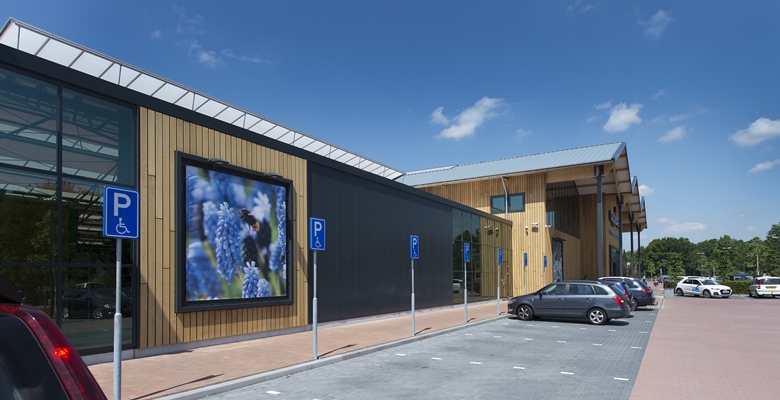 De warme houten gevel, grote glasvlakken en overstekken, werken erg uitnodigend. De entree markeert zich door 3 hoge kappen, die dwars op de rest van de kappenstructuur zijn geplaatst. Op de hoek van het gebouw is het 2-laagse tuincafé gepositioneerd, dat stedenbouwkundig ook meteen de blikvanger vormt aan de rondweg.