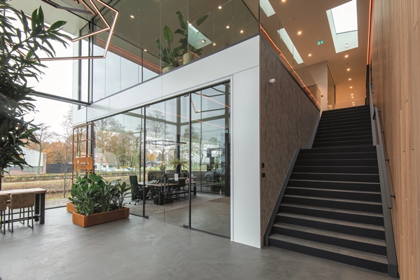 Een grote luifel die naar binnen vouwt, vormt de entree van de nieuwe thuisbasis voor Bouwbedrijf van Middendorp. Het expressieve hoofdgebaar geeft naast entree ook de scheiding tussen begane grond en verdieping vorm en begeleidt bezoeker en gebruiker, door het kantoordeel, via een grote trap naar boven, richting de showroom. Naast functionele scheiding draagt de vormgeving, met zijn grote overstekken, bij aan het weren van de zomerzon en voorkomt het de directe opwarming van de kantoren op de begane grond.