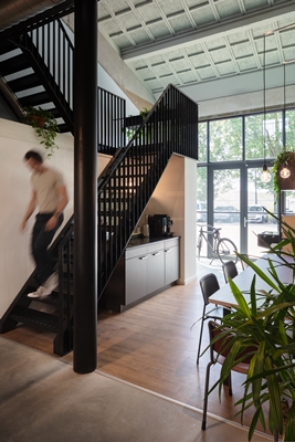 In gebouw 5, een voormalige opslag en garage voor tanks en legervoertuigen, heeft een ware transformatie plaatsgevonden. Waar het zich ontpopt heeft van een rauw industrieel object tot een warm, inspirerend geheel met behoud van originele elementen als een eerbetoon aan de historische functie die heet ooit bekleedde. Hal2 heeft het design en build traject optimaal tot z’n recht laten komen en met een strakke planning en coördinatie in 2 weken tijd een werkbaar kantoor opgeleverd. Waarbij het kenmerkende groen van de omgeving naar binnen is gehaald, de historie als basis heeft gediend, huisstijlelementen groots zijn verweven in het nieuwe interieur en de visuele presentatie van opgeleverde werken prominent aanwezig is. Hal2 heeft het volledige schilderwerk verzorgd en alle vloeren voorzien van maatwerk bekleding en details. Een verlichtingsplan ontworpen, uitgewerkt en gemonteerd, en het kantoor voorzien van passend meubilair. De gehele werklocatie wordt gesierd door maatwerk details en accessoires. Bijzondere aspecten zijn het maatwerk tapijt op de vloer en wanden waarop hun eigen grafische handschrift is achtergelaten. En ook de wonderkamer is een bijzondere ruimte, een creatief toevluchtsoord om te brainstormen en vergaderen.