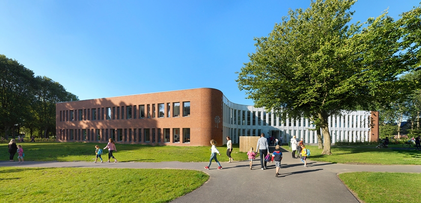 Het opvallende oranjerode metselwerk van de gevel in combinatie met de witte metalen beplating zorgt voor een frisse uitstraling. Uitgangspunt voor het interieur is het gebruik van natuurlijke tinten die naar het park verwijzen.