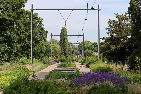 Het dubbele spoor is nog steeds herkenbaar in het nieuwe park. Als herinnering aan het spoorverleden is gebruikgemaakt van hergebruikte spoorstaven in de voetpaden en verblijfsplekken. Ook het behoud van de spoorportalen en het aanplanten van zuilbeuken zorgt ervoor dat de historische spoorlijn goed zichtbaar is gebleven.