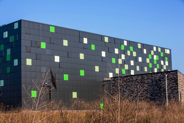 De nieuwe gymzaal is midden in de woonwijk gelegen, tussen twee boomgroepen in. Voor het ontwerp van het gebouw heeft Ralph van Zon van Croonen Architecten zich laten inspireren door het bladerdek van deze boompartijen. “Door de gevel uit te voeren in Dri-Design-cassettes van Kingspan, in drie tinten groen, ontstaat niet alleen een dynamisch geheel maar worden de boomgroepen als het ware ook via de gevel met elkaar verbonden. Een deel van de groene cassettes is bovendien een slag gedraaid om het spel van de bladeren extra te accentueren. Door ook te variëren met de hellingshoek en diepte van de antraciet gekleurde cassettes weerspiegelt de lucht in de gevel. Dat tezamen maakt dat de nieuwe gymzaal minder massief oogt in de wijk.”