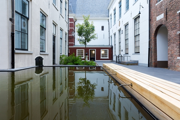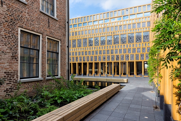 De levendige, centrale binnenplaats doet dienst als huiskamer van de stad. Het oude burgemeestershuisje vormt nu de entree van het complex. Op het plein een vijver met strakke waterspiegel. Water klatert uit spuwertjes in de brede zitbank. Heesters, vijgenbomen en schaduwminnende planten leveren de groene toon. De blauwe regen langs de gevels voegt er iets intiems aan toe. Niet voor niets is deze binnenplaats een geliefd decor voor huwelijken.