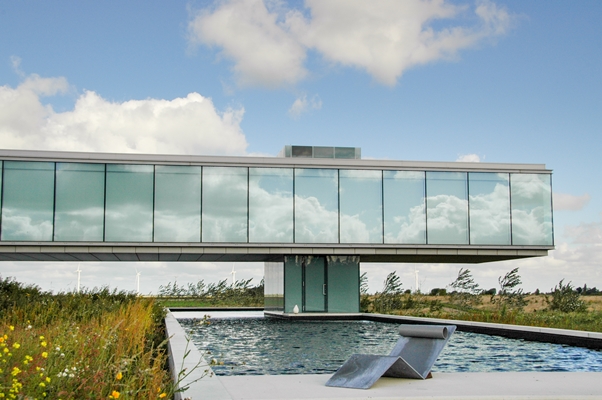 Wie de brug over de vijver passeert, ziet al een stukje van het moderne woonhuis dat in nauwe samenhang met de omgeving is ontworpen. Op het dak prijkt 280 m2 aan zonnepanelen: meer dan voldoende voor deze duurzame villa om volledig in haar eigen energiebehoefte te voorzien. Een ondergrondse entree is via een hellingbaan bereikbaar. Dankzij grote glaspartijen hebben de bewoners vanaf de bovengrondse woonlaag een eindeloos uitzicht op de tuin, het polderlandschap en de Stormvloedkering aan de horizon.