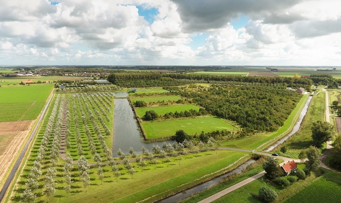 Midden in de Zeeuwse polder is 25 hectare aardappelveld omgetoverd tot een stoer landschap van wuivende abelen en opschietend hout. Stevige bosaanplant, bomenweides en een enorme waterpartij vormen de robuuste basis van een modern landgoed. De route voert over sierlijke, slingerende paden naar een eigenwijze ecovilla en formidabele vijver. Het terrein is een beschermd gebied en onderdeel van Natuur Netwerk Nederland.