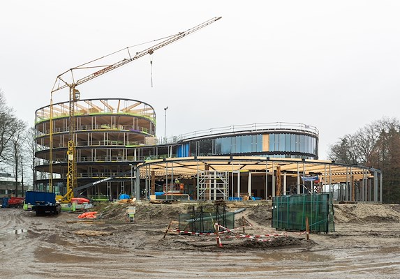 van de organisatie een uiterst duurzaam gebouw. Dat zit hem niet alleen in de bio-based materialen, maar ook in het ontwerp van architect Thomas Rau. Zo kan het gebouw namelijk worden gedemonteerd en elders weer worden neergezet. Voor dit uitdagende project werd Knauf om advies gevraagd voor de vloeren en de scheidingswanden. De verdiepingsvloeren zijn namelijk van hout en dat vroeg om lichte, brandveilige en goed geluidsisolerende oplossingen. In bouwteam met aannemer J.P. van Eesteren en Muller Afbouw Groep adviseerde Knauf een compleet nieuw vloersysteem én verschillende varianten van het Knauf Hybride Circulaire wandsysteem.