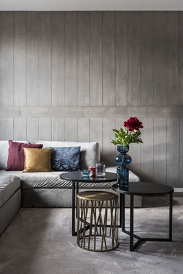 Voor de vloer en wandafwerking in de woonkamer is gekozen voor het product BƩton CirƩ van Beal Mortex. Doordat deze dunne pleisterlaag naadloos is aangebracht verbindt het de verschillende woonfuncties tot een geheel. Een perfect alternatief op het klassieke beton met een industriƫle betonlookuitstraling. Naast deze wandafwerking is er nog een eyecatcher aangebracht in de woonkamer. Een ruige betonlookwand. Deze wand met beton bekistingstructuur is handgemaakt met de producten van Beal Mortex.