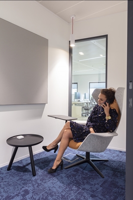 De fauteuils zijn voorzien van draaibare laptop tafels, zodat de stoelen ook als informele werkplek gebruikt kunnen worden.