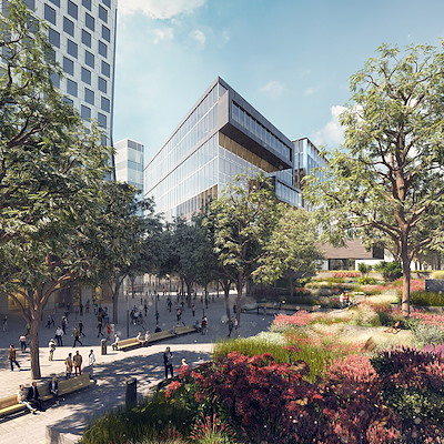 Hoe breng je rust, eenheid en overzicht aan in een stationsgebied dat zoveel functies en onderdelen heeft, zowel ondergronds als op een verhoging? Het antwoord: de verschillen slim onder één noemer brengen in een getrapt landschap. Granieten muren creëren samenhang met de bebouwing. En groene, begroeide muren vangen hoogteverschillen op en geven het gebied een sfeervolle, natuurlijke uitstraling. Hoe verder weg van het station, hoe meer groen. ‘Steen’ wordt ‘struik’ in een vloeiende overgang.