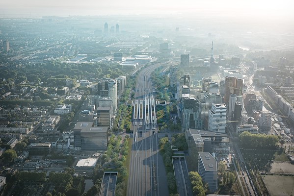 Dus zoeft de automobilist in de toekomst over een goed doorstromende ringweg met mooi begroeide afscherming. Een gebied dat eenheid uitstraalt en waar elke ‘achterkant’ ook een groene voorkant is. Bij gebrek aan files om naar te kijken, kunnen de reizigers op en rond het station genieten van een modern stedelijk landschap met een weelde aan bloeiende natuur.