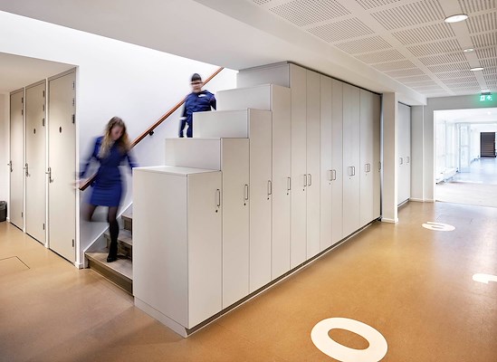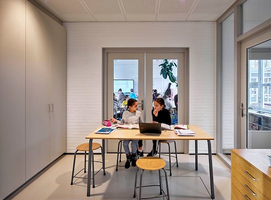 Een onlosmakelijk onderdeel van de verbouwing is het meubilair op maat dat overal in het gebouw een plek heeft gekregen. De aanwezigheid van voldoende kastruimte, ter vervanging van de tot leerruimtes omgevormde opslagruimtes, is cruciaal voor het goed functioneren van de school. Niet alleen om lesmateriaal, jassen en tassen op te bergen maar ook om het werk van kinderen tentoon te stellen zoals in de vernieuwde entreehal die het hart van de school vormt. Ook het meubilair is in nauw overleg met het schoolteam tot stand gekomen. Hierdoor worden de ruimtes nu optimaal gebruikt en gewaardeerd.