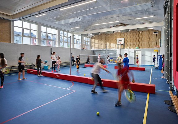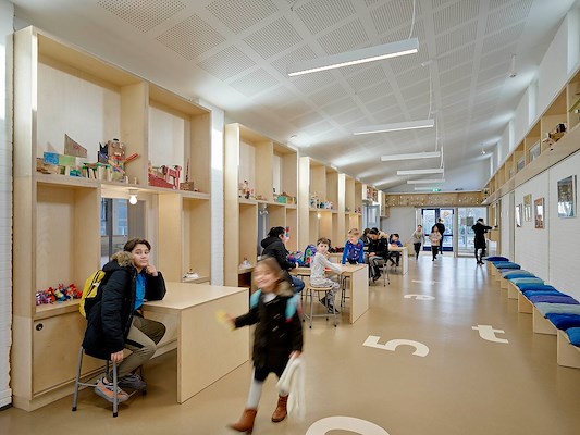 De gymzaal en de aula met keuken zijn nu dankzij subtiele aanpassingen ook los van de rest van de school toegankelijk zodat ze ook voor lokale activiteiten buiten schooltijden beschikbaar staan. De vernieuwde hal en ontmoetingsruimte, de nieuwe ouderruimte en de aula vormen het nieuwe kloppend hart van de school; open verbonden met de buurt en ruimte biedend aan ouders en buurtbewoners om elkaar te ontmoeten en de ontwikkeling van hun kinderen te volgen.