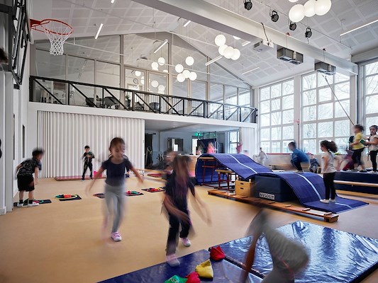 Een belangrijk onderdeel van de plannen was de vergroting van de gymzaal. Hiervoor is één van de vleugels van het gebouw op een onzichtbare en restauratieve wijze verlengd waardoor de kenmerkende typologie van de H-school met de halfomsloten grote buitenruimtes niet is aangetast. De nieuwe maat van de gymzaal maakt het mogelijk om met meerdere groepen tegelijk te gymmen en de ruimte ook beter extern te kunnen verhuren aan verenigingen. Door de kleedkamers naar de zolder te verplaatsen werd ook de nodige ruimte vrijgemaakt voor een grote toestellenberging, een ruimte voor de gymleerkracht en een brede toegang naar de gymzaal.