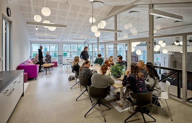 Belangrijk uitgangspunt van het plan was het veranderen van de klassieke leeromgeving met klaslokalen naar een meer gedifferentieerde leeromgeving met naast de groepsruimtes ook kleinere leerplekken voor kleinere groepen leerlingen en individuele begeleiding dicht bij de groepsruimtes. Overbodige en onnodige grote verkeersruimtes en bergingen zijn veranderd in leerplekken door het hele gebouw waardoor de school één continue leeromgeving is geworden. Deze ‘chirurgische’ aanpak leverde extra ruimte op in de lesvleugel zonder het gebouw hiervoor daadwerkelijk te hoeven vergroten. De overmaat aan ruimte, zoals aanwezig in het originele gebouw, was in de uitbreiding uit 2012 helaas niet voorhanden. Om daar de nodige extra leerplekken te creëren, zijn nieuwe ‘erkers’ aan de bestaande groepsruimtes opgehangen, op de verdieping van de dubbelhoge glazen gang.