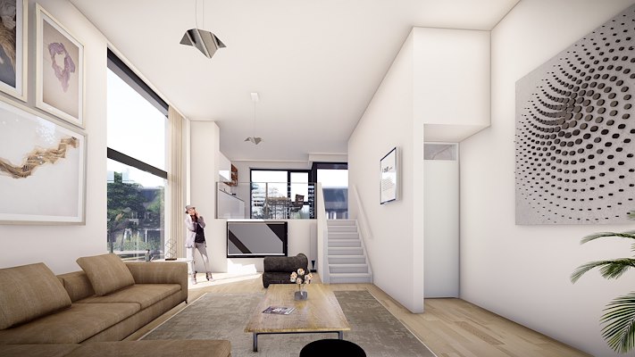 In 2016 heeft AAARCHITECTEN de prijsvraag gewonnen van deelplan SSK4a van het nieuwe woongebied op de voormalige Simon Stevin Kazerne, aan de oostrand van Ede. Het plan bestaat uit 16 geschakelde parkrandwoningen en één vierkapper. Contact met de natuur vormt het centrale thema in het ontwerp, zowel op stedenbouwkundig als landschappelijk niveau. De woningen van SSK4a liggen op de overgang van het woongebied naar het heidepark en zijn aan twee zijden op het openbaar gebied georiënteerd. Het contact met de woonstraatjes én het heidepark in het zuiden hebben wij vertaald in een bijzondere woningtypologie, door het wonen op te tillen ten opzichte van de omgeving. Hierdoor ontstaat er een maximale relatie met de natuur en de seizoenen. De 6 meter brede parkrandwoningen worden ontsloten vanuit woonstraatjes. Twee parkeerplaatsen per woning maakt de woning vooral aantrekkelijk voor tweeverdieners en doorstromers. De typologie is gebaseerd op een combinatie van een split–level woonlaag met een gelijkvloerse slaapverdieping.