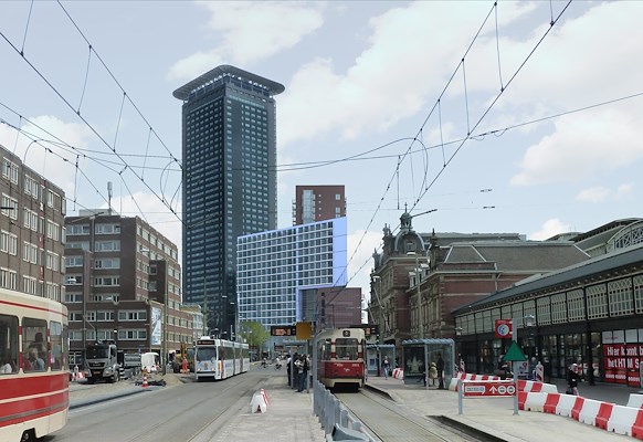 Een “strip” vormt de begeleiding van het spoor en mondt uit in een 70 m hoge “toren” aansluitend aan Het Strijkijzer, een 132 m hoge woontoren. Een hoge “schijf”, aan de centrumzijde van Den Haag, vult de ruimte tussen deze “strip” en Het Strijkijzer en vormt tevens de verbinding tussen beide volumes. De toevoeging van de “toren” zorgt voor functionele en visuele verdichting aan de spoorzijde en haalt Het Strijkijzer, tevens een ontwerp van