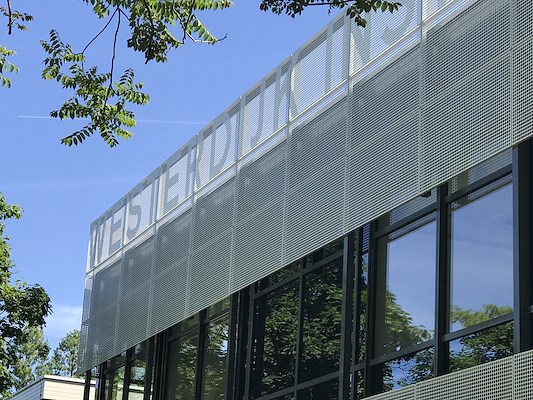 Om de nieuwe uitbreiding van het Westerdijk Institute is een geperforeerde huid gespannen van geperforeerde witte aluminium panelen. Deze voile geeft het gebouw een interessante gelaagdheid en is daarmee mystiek passend bij de bijzondere functie van het gebouw. De huid is niet alleen esthetisch maar biedt ook bescherming en beveiliging.