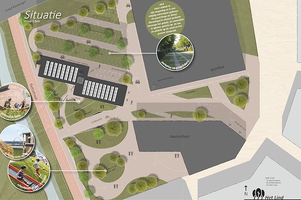 Het Lindeveld wordt, net als Fort beneden Lent en de Boomgaard een groen moment aan de watersingel. Lind is een schijfvormig gebouw, die de bewoners en schoolkinderen tegen het geluid van de Graaf Alardsingel be[scherm]en als een leilinde #ThuisVoelen.