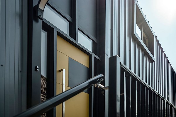 . Deze zijn geplaatst op een zichtbare staalconstructie en gecombineerd met zwarte aluminium kozijnen. De onafgewerkte binnenzijde van de constructie maakt de woning tot een echte loftwoning. De achterzijde van de woning bestaat uit ramen, waardoor er enorm veel daglicht binnenkomt.