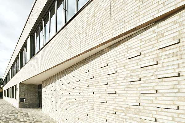 De architecten kozen voor de gevel de Hagemeistersortering Farsund HS, in grijsachtig wit met bijna blauwachtige accenten, genuanceerd met een ferme kolenbrand en een handstrichachtige oppervlaktestructuur. “Münsterland is baksteenland. We hebben een voorliefde voor die regionale referentie ", zegt Frank Lohse en voegt er aan toe:" Met de keuze voor deze steen onderscheidt de school zich van de omringende bebouwing, die overwegend in rode baksteen is uitgevoerd.”