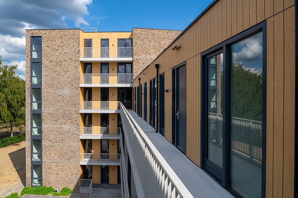 De gevels zijn opgetrokken in een warme, bruine gemetselde gevelsteen, en hebben hoge raampartijen met ruime, inspringende balkons. De Vries: “Hout past perfect bij dit warme gevelbeeld, maar onze opdrachtgever wilde wel een oplossing die zo