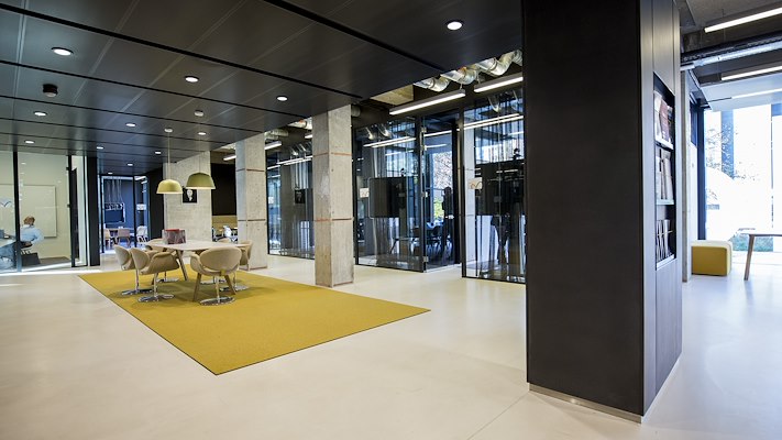 Bij de vier kantoorentrees zijn vides gemaakt, met rondom ontmoetings- en ontspanningsruimtes over de volle diepte van het pand, zoals de receptie, bezoekerslounge, een koffiebar, een ruimte voor sport en een restaurant. Minstens zo belangrijk voor een fijne werkomgeving zijn uitstekende akoestische prestaties, verzekert Haumann: “Om de ruimte gevoelsmatig en akoestisch niet te hard te maken hebben we diverse stofferingen aangebracht. Natuurlijke materialen zoals hout, touw, leer en stof zorgen voor de zachtheid, die nodig is om je thuis te voelen. De warme kleuren van zon, zand en aarde ondersteunen dit.”