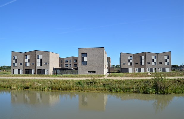 . De lichte knik in de dakrandafwerking zorgt voor herkenbaarheid van de afzonderlijke woningen. Deze herkenbaarheid wordt versterkt door het lijnenspel: een combinatie van de aluminium muurafdekkap met de met een aluminium plaat afgedekte en in de gevel verzonken hemelwaterafvoer, die het metselwerk doorsnijdt. De aluminium schuifpanelen zorgen, afhankelijk van de stand, voor dynamiek in de gevel . Dat geldt ook voor de crèmewitte aluminium buitenzonwering in de vorm van louvres. Deze aluminium panelen hebben op maaiveldniveau de functie van een