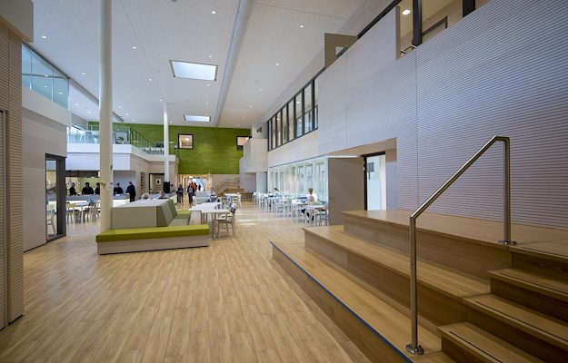 Marlies Rohmer heeft een slimme en flexibele hoofdopzet gemaakt die allerlei vormen van dubbelgebruik faciliteert. Naast reguliere ruimtes en gangen zijn er grote en kleine nissen en hoeken, die multifunctioneel gebruikt kunnen worden. Veel kinderen verplaatsen zich in rolstoelen, daarom bedacht de architect een routing met opbergplekken voor rolstoelen en andere hulpmiddelen uit het zicht. “In het bouwdeel met voorzieningen voor peuteropvang, onderwijs en revalidatie heb ik rondgaande gangen ontworpen, zodat de kinderen rondjes kunnen rijden. In plaats van een brede gang van 3.60 meter, heb ik twee parallelle gangen van 1.80 meter gemaakt, met daartussen een zone met opbergplekken en zit- en werknissen. Ik noem dat een zone à la carte. Ik snoep van alle lokalen, therapie- en kantoorruimtes een klein stukje af. Die vierkante meters bundel ik samen tot die extra ruimtes à la carte, die een functie kunnen krijgen waar op dat moment het meeste behoefte aan is”, legt Rohmer uit. “We wilden geen ‘tilliftensfeer’, maar een zo gewoon mogelijk gebouw. Veilig, toegankelijk en uitnodigend zoals elke school, maar ook speciaal waar nodig, het is tenslotte een voorziening voor kinderen met een lichamelijke, verstandelijke, meervoudige of sociaal-emotionele beperking.”