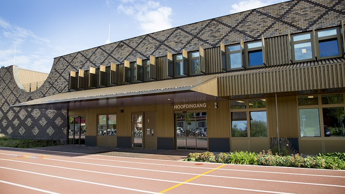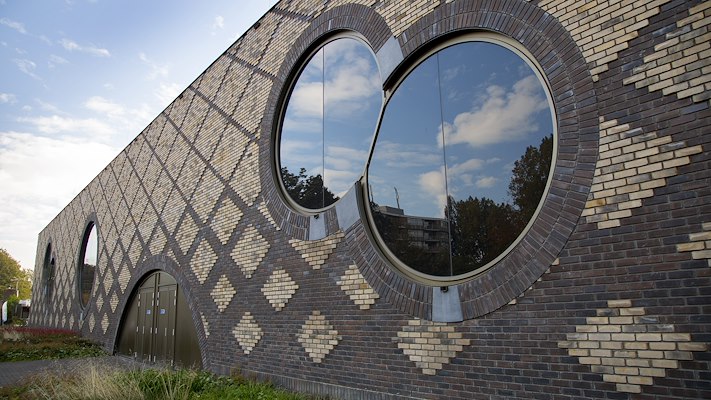 Een patroon van gele ruitvormen op een bruine achtergrond kenmerkt de bakstenen gevels rondom het gebouw. Met het oog op vervuiling verloopt het metselwerkpatroon van onder naar boven van donker naar licht. Eyecatchers zijn de grote ronde ramen in de noordgevel, die het sportcomplex van daglicht voorzien. Op meer plekken verlevendigen halve cirkelvormen de gevels.
