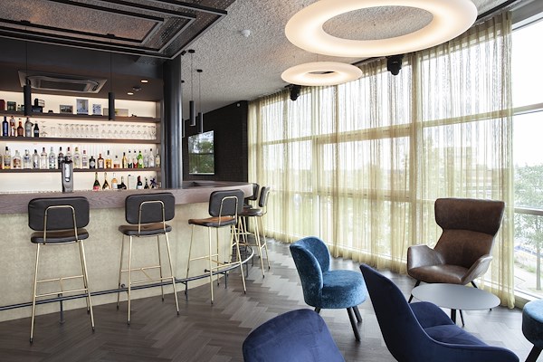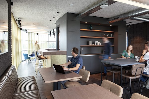 en vooral qua uitzicht en functionaliteit afwijkt van de rest van het gebouw. Hier kunnen collega’s maximaal ontspannen. De ruimte waarin hoge lunchtafels staan, gaat via de bar vloeiend over in de ruimte met comfortabele zitjes. De gouden spijlen van de barkrukken matchen met de gouden barbekleding en de gouden vitrages. De cirkelvormige plafondlampen volgen de rondingen van de ramen. Als het donker is, maakt het licht van deze lampen plaats voor de verlichte skyline van Arnhem. En op vrijdag voor de discolampen, wanneer de overwegend jonge werknemers van Breedband het weekend inluiden.