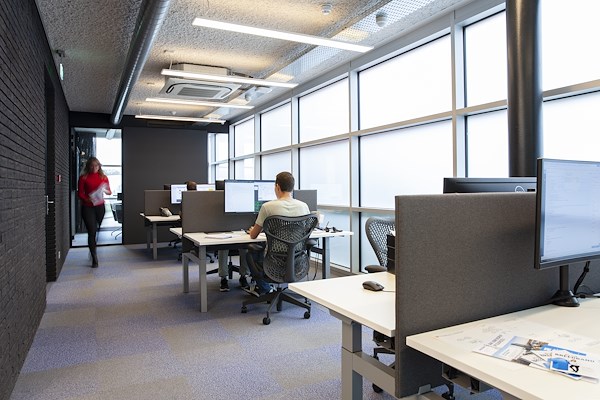 De ruimtes waar hoofdzakelijk aan computers wordt gewerkt, zijn sober en functioneel ingericht. Door de stijlvolle vitrages is er voldoende zicht naar buiten, terwijl de inkijk beperkt is. De ramen grenzend aan een woning zijn bekleed met folie dat alleen licht doorlaat. Op de vloer liggen tapijttegels, waarvan de door Judith ontworpen kleurovergangen en kleurstelling refereert aan de huisstijl van het bedrijf. Op elke verdieping is een pantry, waar collega’s kunnen ontspannen met een kop koffie of thee. De kleur ervan is afgestemd op die van de karakteristieke gemetselde wanden.